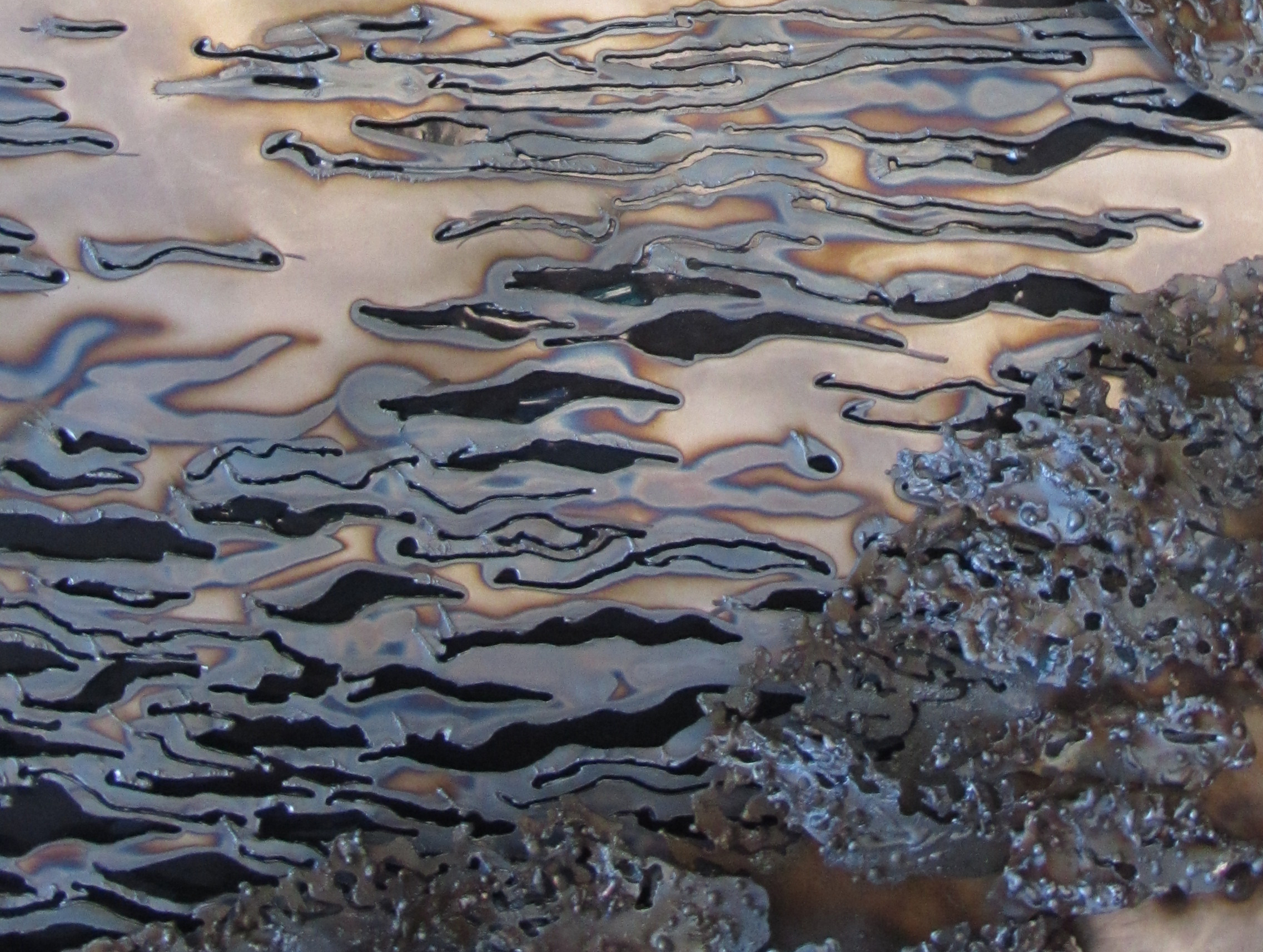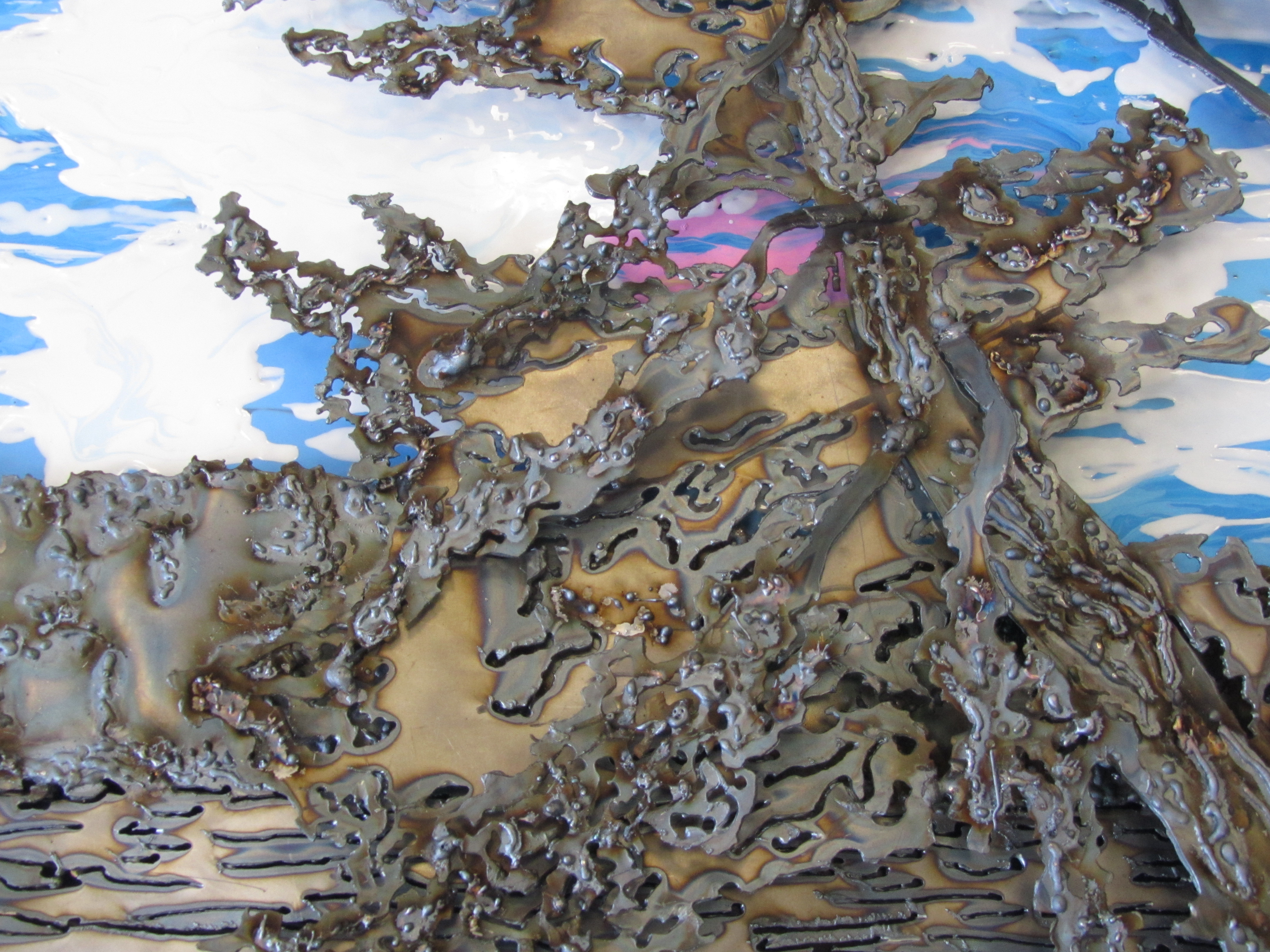 A Walk in the Bush, Sheet Metal and Plexiglass, Gel Medium and Acrylic Paint, 36″ x 26″, 2011