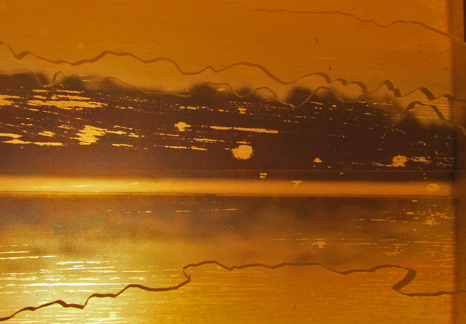 Lorimer Lake Sunset take 2, Sheet Metal and Plexiglass, Gel Medium and Acrylic Paint, 8″ x 10″, 2011