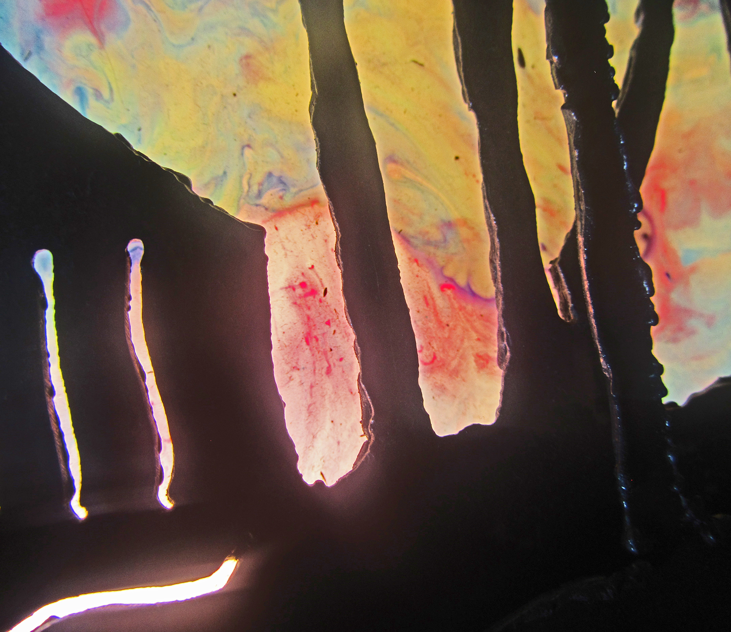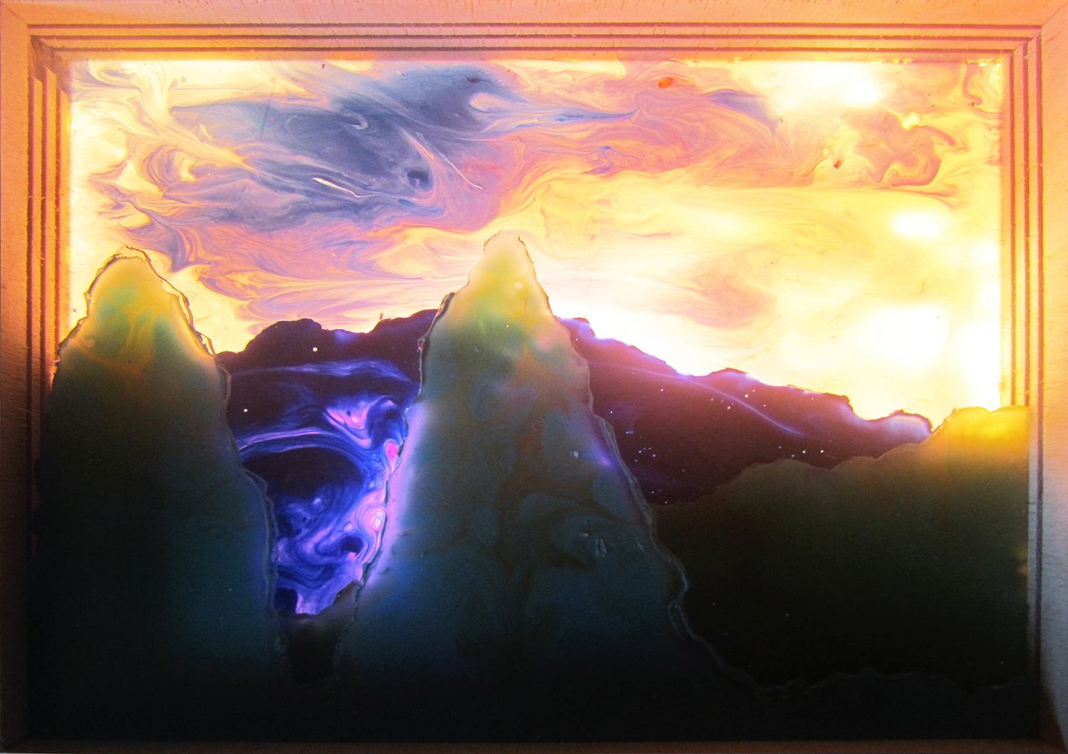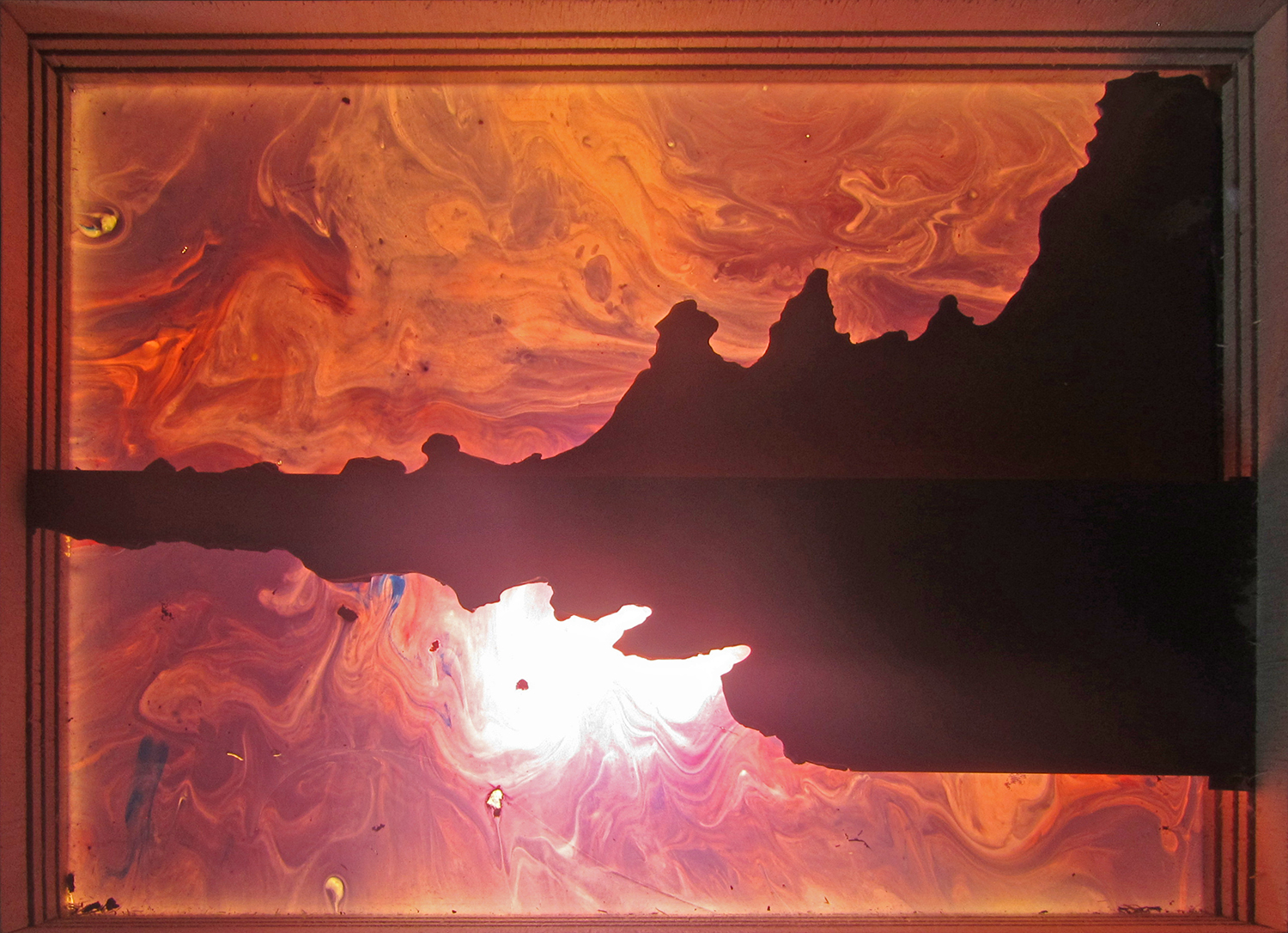 Off The Island, Sheet Metal and Plexi glass, Gel medium and Acrylic paint (light box), 26″ x 36″, 2012